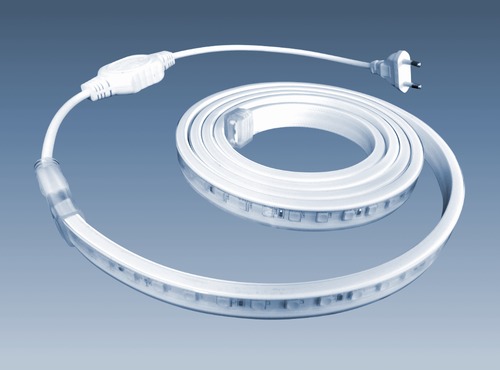 LED-Streifen in robuster, flexibler Kunststoffhülle, 8,5 W/m, 72 LED/m, dimmbar, 17 mm breit, 50 m lang (auf Rolle abgepackt), alle 100 cm trennbar. Stromversorgung mittels 230 V (kein Transformator erforderlich)