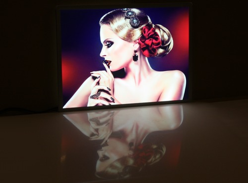 LED-Flächenleuchte zur Hinterleuchtung von Fotos und Grafiken. Besonders schlanke/flache Bauform (nur 10 mm tief). Formschöner Aluminiumrahmen mit Möglichkeit der Wandmontage oder Aufstellung auf Boden, Theke o.ä. Für Fotos/Grafiken in der Größe 297 x 210 mm