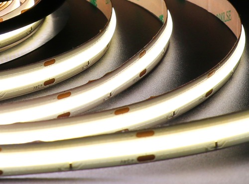 Flexible LED strip, equipped with seamless COB LEDs (528 chips/m), creating an uniform light band without any visible LED dots (totally dot-free), beam angle 180°, CRI > 90, self-adhesive, width 10 mm, dimmable, length 5 m, cuttable each 45 mm
