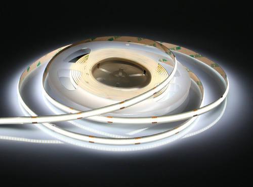 Flexible LED strip, equipped with seamless COB LEDs (480 chips/m), creating an uniform light band without any visible LED dots (totally dot-free), beam angle 180°, CRI > 90, self-adhesive, width 8 mm, dimmable, length 5 m, cuttable each 50 mm